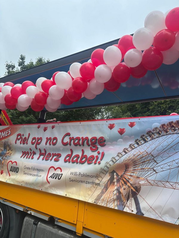 In diesem Jahr hieß es endlich wieder:,, Einmal im Jahr, ist Kirmes in Crange. Einmal im Jahr ist Kirmes am Kanal…''. Auch das Grete- Fährmann war in diesem Jahr wieder mit dabei. Los ging es am Samstag, den 02.08.25 mit dem alljährlichen Festumzug. Mitarbeiter*innen fuhren erstmalig auf einem geschmückten LKW mit und präsentierten mit Freude ihr Haus. Vor dem LKW fuhr ein Planwagen gemeinsam mit Bewohner*innen und Angehörigen. An Wurfmaterial mangelte es beiden Fahrzeugen nicht. Der Soziale Dienst rief zusätzlich zu den eigens organisierten Wurfmaterialien zu Spenden für die Bewohner*innen auf und mit großer Freude wurde der Ruf gehört. Kuscheltiere, kleine Bücher, Trillerpfeifen, Schlüsselanhänger, Glückszwerge und vieles mehr wurde gespendet. Beide Wagen hatten ihren eigenen DJ und so wurde gefeiert was das Zeug hält.